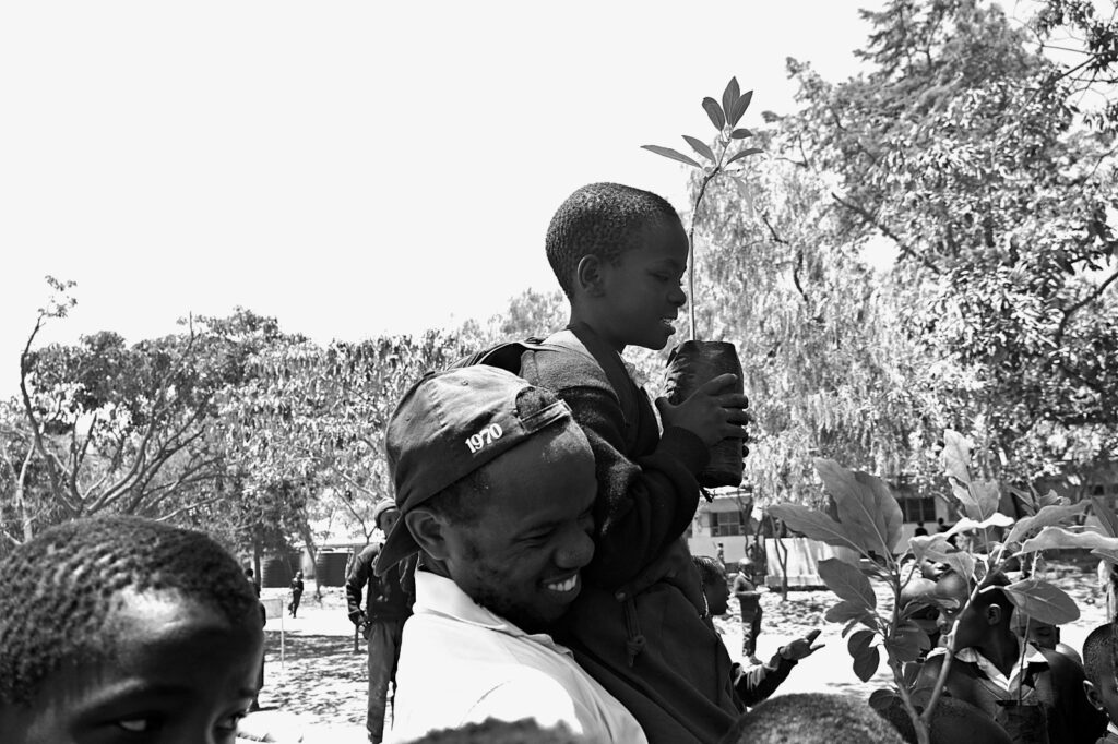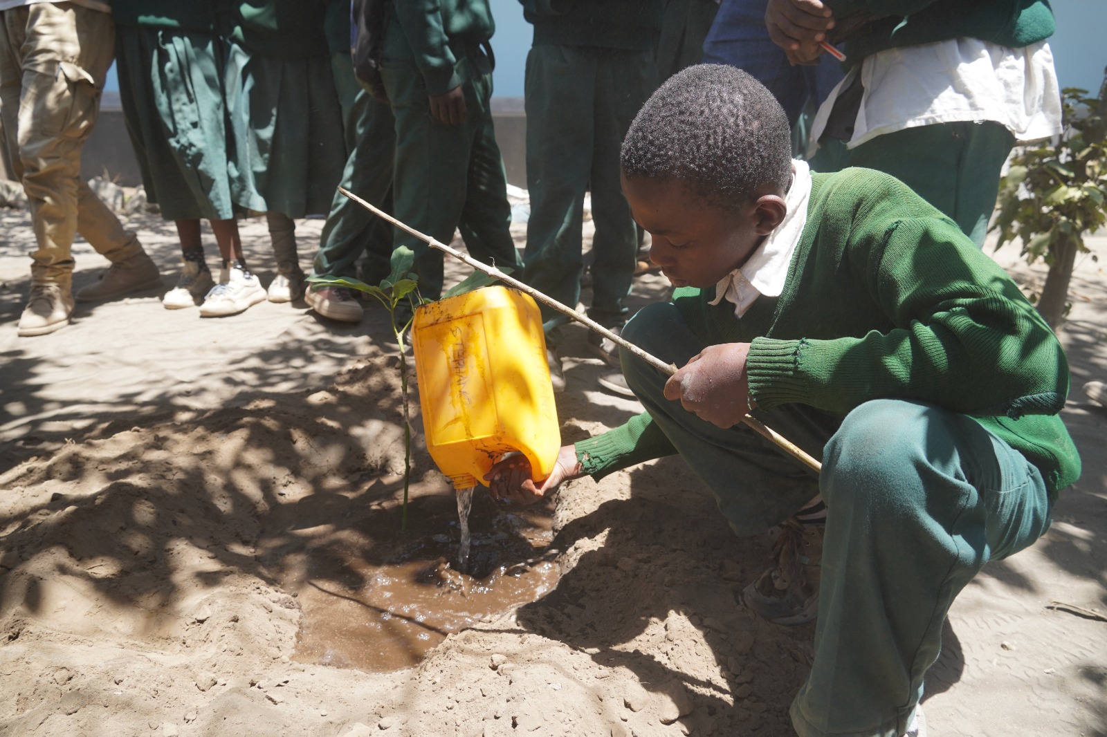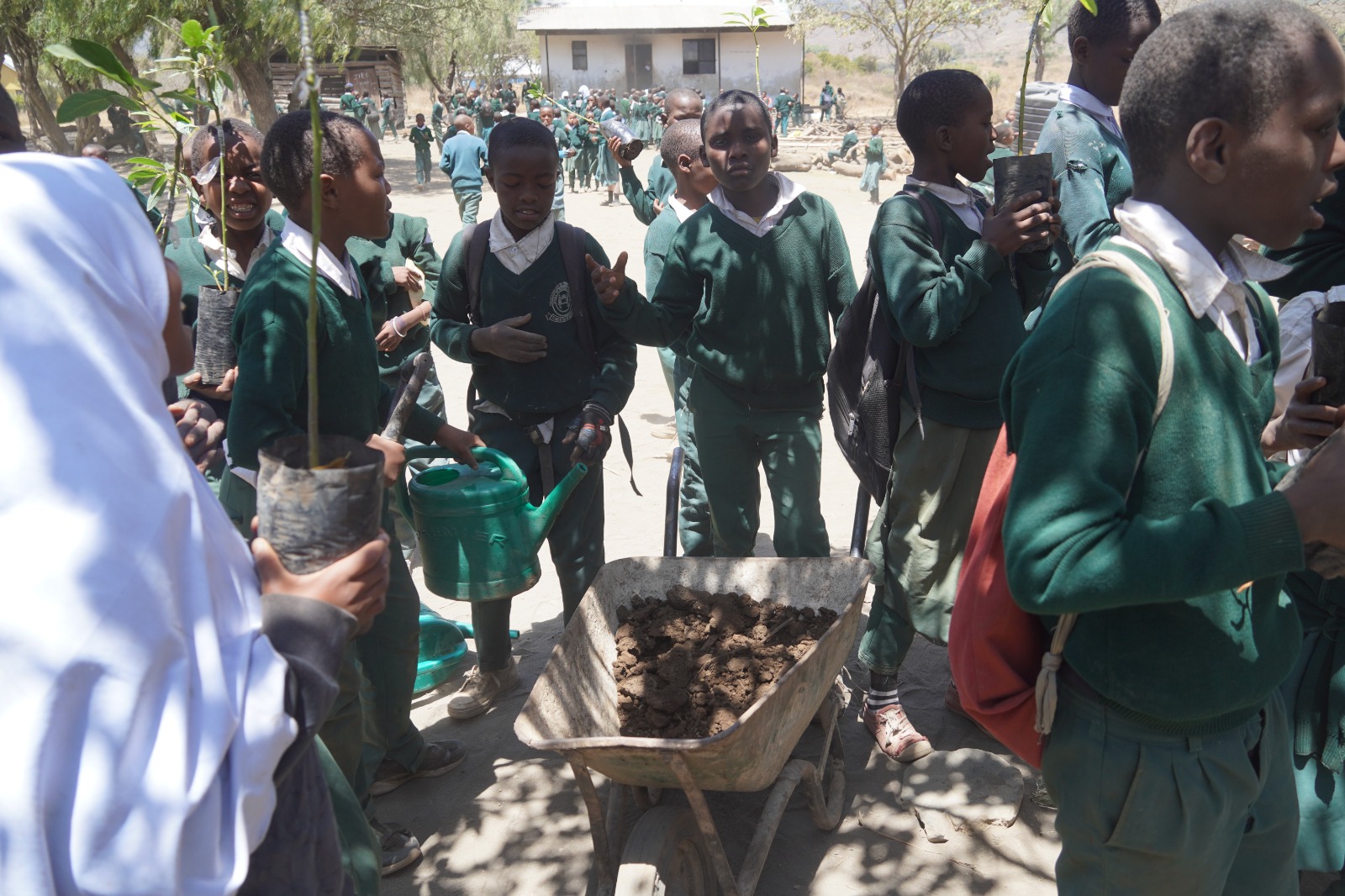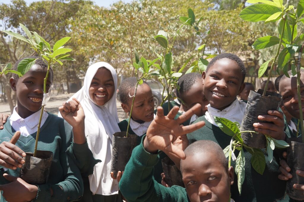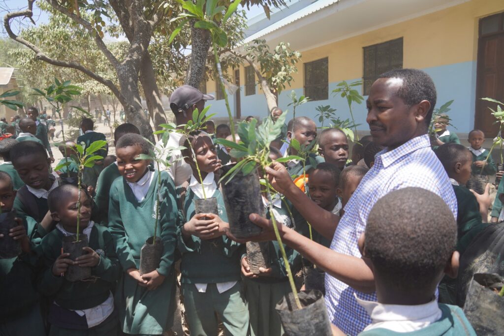 Distributing avocado tree seedlings to students of Leminyori Primary School for planting to their school compound